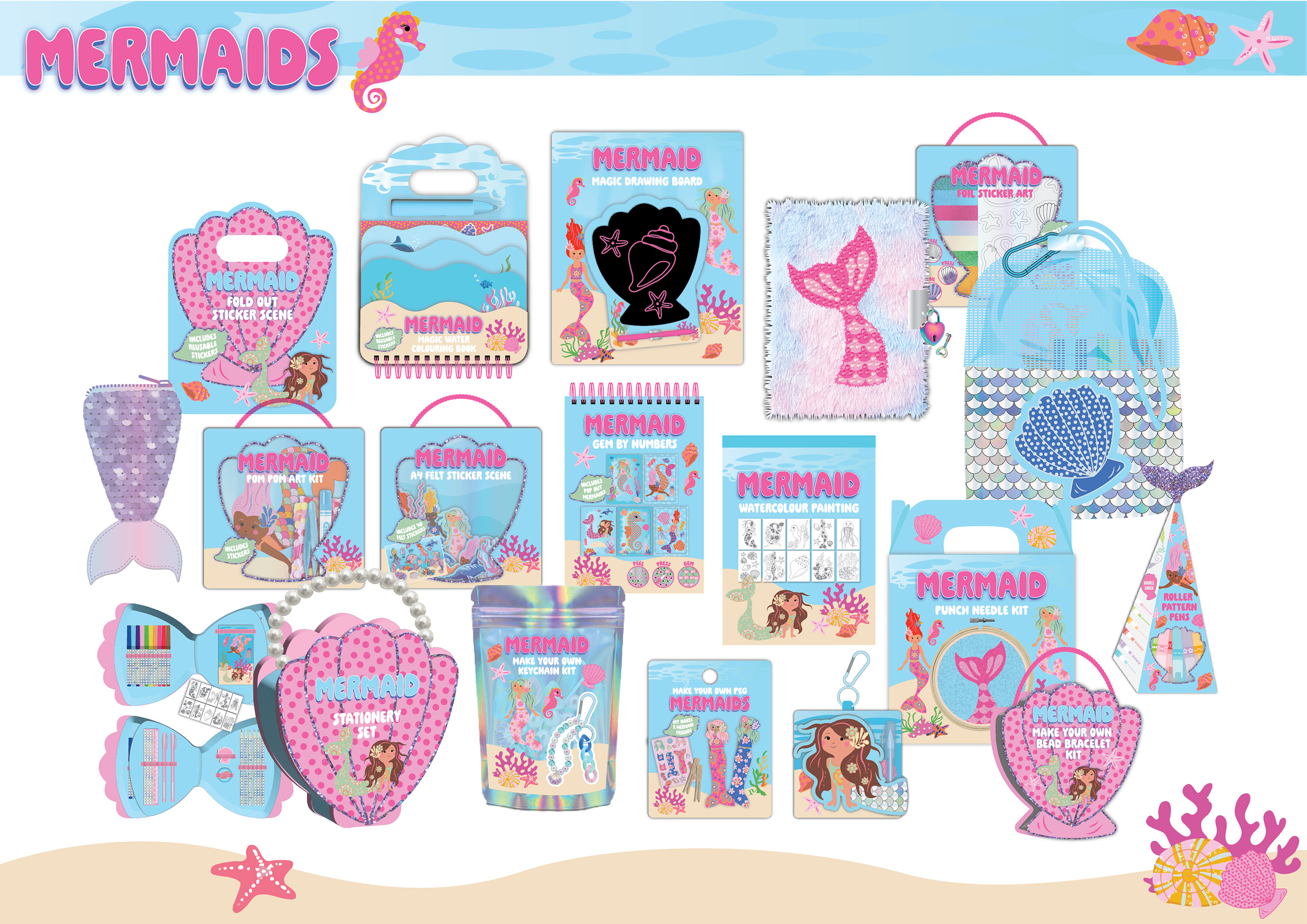 This project was created for a client brief to design a playful, mermaid-inspired stationery collection packed with novelty appeal. The goal was to capture the magic and whimsy of an underwater world while ensuring the range felt trend-led, commercially viable, and engaging for the target audience. From shimmering holographic finishes to shell-shaped packaging and ocean-inspired colour palettes, the designs explored a variety of fun concepts that blended practical stationery with imaginative, play elements.